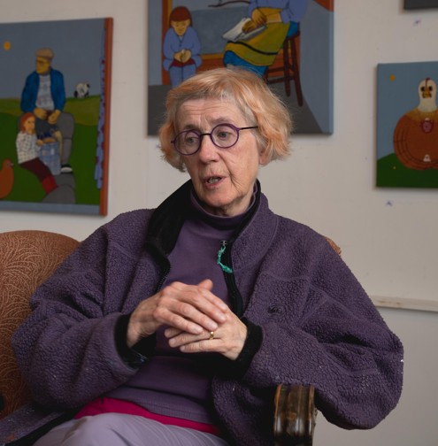 The colourful, naivistic and surrealist paintings of Faroese artist Sigrun Gunnarsdóttir (born 1950) tell strong stories. With her distinct and unique style, she is a significant and highly treasured artist in the Faroe Islands.  Sigrun’s paintings are simple in style yet intricate in connotations. Her thoughts,  hopes, and convictions are reflected on the canvas through universal stories  about home, family, closeness, generations, and being grounded in faith.  The foundation from which she tells her stories is a world of symbols, which include, amongst others, the lily, the sparrow, the key, the angel and the bird.